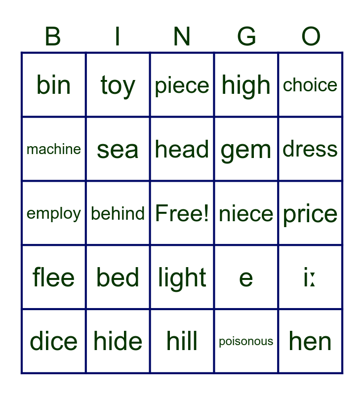This bingo card has a free space and 39 words: ɔɪ, aɪ, ɪ, e, iː, flee, behind, thigh, niece, price, machine, toy, voice, dress, employ, bed, light, high, private, dice, sea, head, poisonous, choice, knife, hide, hill, mice, rich, bin, king, fed, gem, hen, ten, wet, piece, peace and seed.