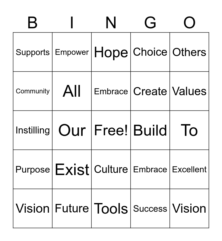This bingo card has a free space and 24 words: Vision, Exist, Embrace, Success, Others, Supports, Empower, Hope, Build, To, Instilling, All, Embrace, Excellent, Community, Future, Tools, Choice, Values, Purpose, Our, Culture, Create and Vision.