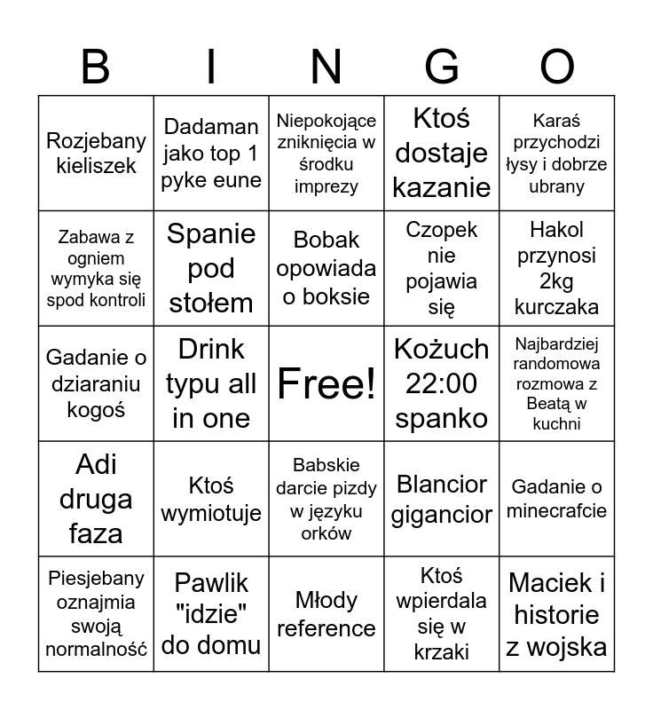 This bingo card has a free space and 24 words: Ktoś wymiotuje, Pawlik "idzie" do domu, Bobak opowiada o boksie, Piesjebany oznajmia swoją normalność, Karaś przychodzi łysy i dobrze ubrany, Rozjebany kieliszek, Zabawa z ogniem wymyka się spod kontroli, Dadaman jako top 1 pyke eune, Kożuch 22:00 spanko, Babskie darcie pizdy w języku orków, Czopek nie pojawia się, Gadanie o dziaraniu kogoś, Blancior gigancior, Gadanie o minecrafcie, Spanie pod stołem, Ktoś wpierdala się w krzaki, Najbardziej randomowa rozmowa z Beatą w kuchni, Niepokojące zniknięcia w środku imprezy, Hakol przynosi 2kg kurczaka, Drink typu all in one, Maciek i historie z wojska, Adi druga faza, Ktoś dostaje kazanie and Młody reference.