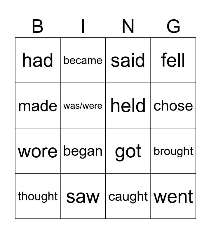 This bingo card has 20 words: brought, took, said, won, thought, made, saw, had, wore, became, began, got, was/were, went, held, knew, chose, fell, caught and sat.