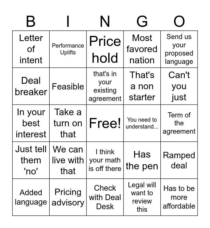 This bingo card has a free space and 29 words: Added language, Stakeholder / endorsers / signatory, Take a turn on that, Close date, Letter of intent, Price hold, Feasible, We can live with that, You need to understand..., Pricing advisory, Term of the agreement, Has to be more affordable, Check with Deal Desk, Legal will want to review this, Can't you just, Which version are you working from?, I think your math is off there, Just tell them 'no', Send us your proposed language, In your best interest, Has the pen, Turn on track Changes, That's a non starter, Deal breaker, Most favored nation, Performance Uplifts, Ramped deal, that's in your existing agreement and sincere in my position.