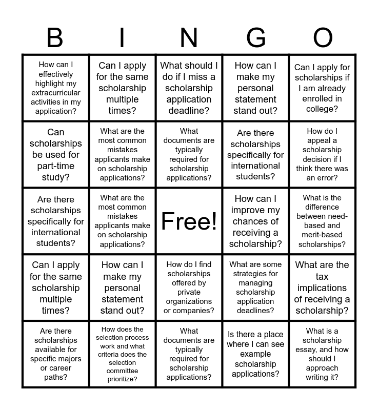 This bingo card has a free space and 61 words: Are there any workshops, webinars, or resources available to assist applicants in preparing their applications?, How does the selection process work and what criteria does the selection committee prioritize?, How do entrance scholarships work?, Can I apply for the same scholarship multiple times?, Is there a place where I can see example scholarship applications?, Are there scholarship scams?, What are the most common mistakes applicants make on scholarship applications?, How do I find scholarships that match my field of study?, Are there scholarships specifically for international students?, What is the best way to request letters of recommendation?, How can I make my personal statement stand out?, What is the difference between need-based and merit-based scholarships?, Can scholarships be used for part-time study?, What are some strategies for managing scholarship application deadlines?, Are there scholarships available for students with disabilities?, How can I effectively highlight my extracurricular activities in my application?, What is a scholarship essay, and how should I approach writing it?, Can I apply for scholarships if I am already enrolled in college?, How do I find scholarships offered by private organizations or companies?, What documents are typically required for scholarship applications?, How can I improve my chances of receiving a scholarship?, What should I do if I miss a scholarship application deadline?, Are there scholarships available for specific majors or career paths?, What are the tax implications of receiving a scholarship?, Can I use scholarship funds for study abroad programs?, How do I handle a scholarship interview?, Are there scholarships available for students with unique talents or hobbies?, What role does financial need play in scholarship applications?, How do I appeal a scholarship decision if I think there was an error?, What are some reliable sources to search for scholarships?, Are there any workshops, webinars, or resources available to assist applicants in preparing their applications?, Are there any workshops, webinars, or resources available to assist applicants in preparing their applications?, How does the selection process work and what criteria does the selection committee prioritize?, How do entrance scholarships work?, Can I apply for the same scholarship multiple times?, Is there a place where I can see example scholarship applications?, Are there scholarship scams?, What are the most common mistakes applicants make on scholarship applications?, How do I find scholarships that match my field of study?, Are there scholarships specifically for international students?, What is the best way to request letters of recommendation?, How can I make my personal statement stand out?, What is the difference between need-based and merit-based scholarships?, Can scholarships be used for part-time study?, What are some strategies for managing scholarship application deadlines?, Are there scholarships available for students with disabilities?, How can I effectively highlight my extracurricular activities in my application?, What is a scholarship essay, and how should I approach writing it?, Can I apply for scholarships if I am already enrolled in college?, How do I find scholarships offered by private organizations or companies?, What documents are typically required for scholarship applications?, How can I improve my chances of receiving a scholarship?, What should I do if I miss a scholarship application deadline?, Are there scholarships available for specific majors or career paths?, What are the tax implications of receiving a scholarship?, Can I use scholarship funds for study abroad programs?, How do I handle a scholarship interview?, Are there scholarships available for students with unique talents or hobbies?, What role does financial need play in scholarship applications?, How do I appeal a scholarship decision if I think there was an error? and What are some reliable sources to search for scholarships?.