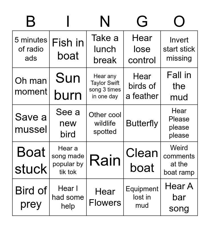 This bingo card has a free space and 32 words: Equipment lost in mud, Hear espresso, See a new bird, Back up trailer in one try!, Boat stuck, Sun burn, Invert start stick missing, Weird comments at the boat ramp, Fish in boat, Hear too sweet, Hear any Taylor Swift song 3 times in one day, Take a lunch break, Find mudflat trash, See a stuck boat, Butterfly, Find non-bird animal tracks, Bird of prey, Save a mussel, Rain, Hear a song made popular by tik tok, Clean boat, Double bagger, Hear Please please please, Hear I had some help, Hear A bar song, Hear lose control, Hear birds of a feather, Oh man moment, 5 minutes of radio ads, Hear Flowers, Bad radio advice and Fall in the mud.