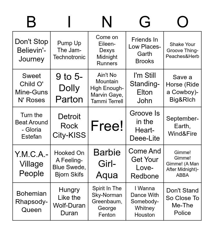 This bingo card has a free space and 25 words: Hooked On A Feeling-Blue Swede, Bjorn Skifs, Spirit In The Sky-Norman Greenbaum, George Fenton, Ain't No Mountain High Enough-Marvin Gaye, Tammi Terrell, Bohemian Rhapsody-Queen, Shake Your Groove Thing-Peaches&Herb, Don't Stop Believin'-Journey, Sweet Child O' Mine-Guns N' Roses, Pump Up The Jam-Technotronic, Groove Is in the Heart- Deee-Lite, Barbie Girl-Aqua, I'm Still Standing-Elton John, Turn the Beat Around - Gloria Estefan, Come And Get Your Love-Redbone, Gimme! Gimme! Gimme! (A Man After Midnight)- ABBA, 9 to 5- Dolly Parton, Man! I Feel Like a Woman- Shania Twain, September- Earth, Wind&Fire, Come on Eileen-Dexys Midnight Runners, Save a Horse (Ride a Cowboy)-Big&RIch, Detroit Rock City-KISS, Don't Stand So Close To Me-The Police, Hungry Like the Wolf-Duran Duran, Y.M.C.A.- Village People, Friends In Low Places-Garth Brooks and I Wanna Dance With Somebody-Whitney Houston.