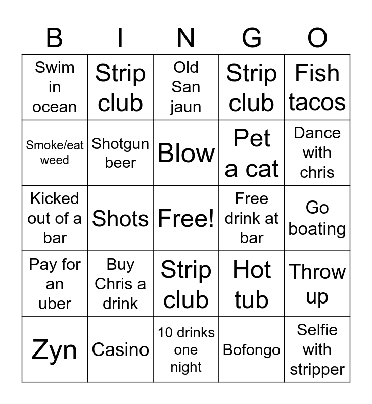 This bingo card has a free space and 29 words: Strip club, Casino, Old San jaun, La placita district, Fish tacos, Swim in ocean, Shotgun beer, Blow, Free drink at bar, Throw up, Zyn, Shots, Bofongo, Selfie with stripper, Kicked out of a bar, Drink a madalla, 10 drinks one night, Hot tub, Dance with chris, Pay for an uber, Buy Chris a drink, Shot between 4am-9am, Pet a cat, Go boating, Smoke/eat weed, Strip club, Strip club, Strip club and Strip club.
