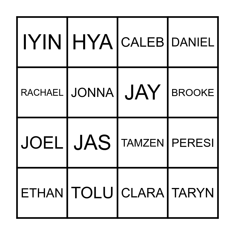 This bingo card has 20 words: PERESI, BRANDON, CALEB, DAVID, ETHAN, RACHAEL, TOLU, IYIN, JOEL, HYA, JAS, TAMZEN, JONNA, TARYN, JAY, HAHA, BROOKE, DANIEL, CLARA and PENELOPE.