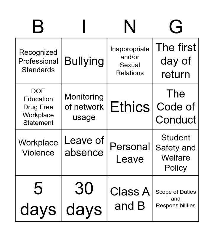 This bingo card has 16 words: 30 days, Student Safety and Welfare Policy, Inappropriate and/or Sexual Relations, Recognized Professional Standards, Workplace Violence, Bullying, Personal Leave, Class A and B, DOE Education Drug Free Workplace Statement, Monitoring of network usage, 5 days, The first day of return, Leave of absence, The Code of Conduct, Ethics and Scope of Duties and Responsibilities.