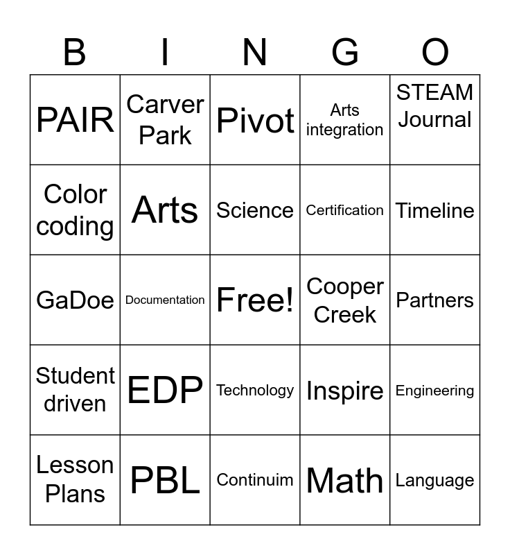 This bingo card has a free space and 24 words: EDP, PBL, Science, Lesson Plans, STEAM Journal, PAIR, Color coding, Carver Park, Cooper Creek, Technology, Certification, GaDoe, Inspire, Engineering, Arts, Math, Partners, Pivot, Timeline, Documentation, Language, Student driven, Arts integration and Continuim.