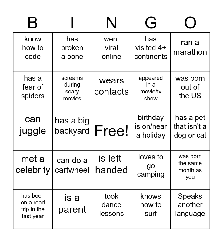 This bingo card has a free space and 39 words: This is their first year at Parmer Park, loves roller coasters, knows how to read tarot, screams during scary movies, has been on a road trip in the last year, is left-handed, wears contacts, is a twin/triplet, ran a marathon, met a celebrity, has a big backyard, has visited 4+ continents, Speaks another language, has a pet that isn't a dog or cat, birthday is on/near a holiday, can do a cartwheel, loves to sing/karaoke, know how to code, started a business, loves to go camping, has a fear of spiders, took dance lessons, appeared in a movie/tv show, was born out of the US, works out before work, Grew up in Austin, good at escape rooms, has 0 unread emails, read 10+ books a year, has broken a bone, has taken a cruise, knows ASL, went viral online, is a parent, knows how to surf, Plays an instrument, was born the same month as you, can juggle and hates coffee.