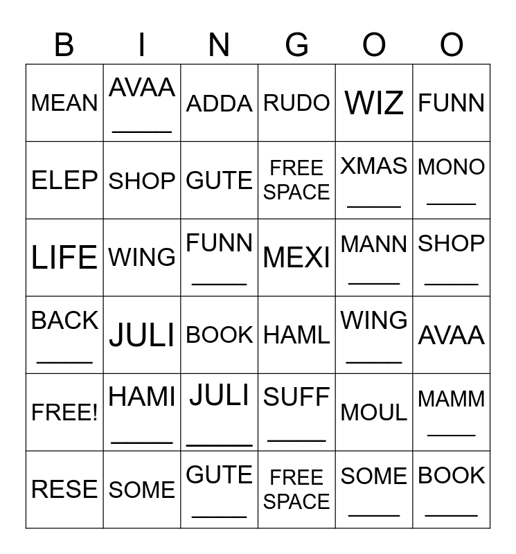 This bingo card has 60 words: Free!, HAML, KIMB, MEXI, AVAA, HAMI, ELEP, MONO, GUTE, XMAS, RUDO, MANN, FUNN, RESE, BACK, MEAN, LIFE, WIZ, SUFF, SHOP, WING, ADDA, BOOK, JULI, MAMM, SOME, MOUL, FREE SPACE, FREE SPACE, FREE SPACE, FREE SPACE, HAML ____, KIMB ____, MEXI ____, AVAA ____, HAMI ____, ELEP ____, MONO ____, GUTE ____, XMAS ____, RUDO ____, MANN ____, FUNN ____, RESE ____, BACK ____, SUFF ____, MEAN ____, LIFE ____, WIZ ____, SHOP ____, WING ____, ADDA ____, BOOK ____, JULI ____, MAMM ____, SOME ____, MOUL ____, FREE!, FREE! and FREE!.
