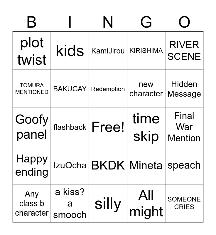 This bingo card has a free space and 24 words: IzuOcha, a kiss? a smooch, Redemption, Any class b character, RIVER SCENE, plot twist, TOMURA MENTIONED, kids, time skip, BKDK, new character, Goofy panel, Mineta, speach, BAKUGAY, All might, Final War Mention, KamiJirou, Hidden Message, flashback, SOMEONE CRIES, Happy ending, KIRISHIMA and silly.