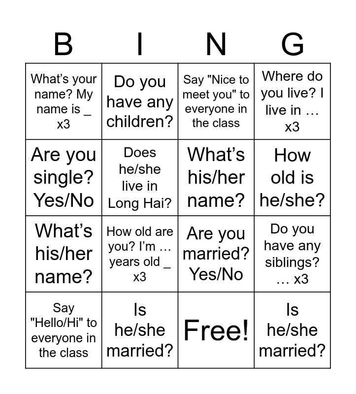 This bingo card has 17 words: Free!, Say "Hello/Hi" to everyone in the class, Say "Nice to meet you" to everyone in the class, What’s your name? My name is _ x3, How old are you? I’m … years old _ x3, Where do you live? I live in … x3, Do you have any siblings? … x3, What’s his/her name?, How old is he/she?, Does he/she live in Long Hai?, Is he/she married?, Are you married? Yes/No, Are you single? Yes/No, Do you have any children?, What’s his/her name?, How old is he/she? and Is he/she married?.
