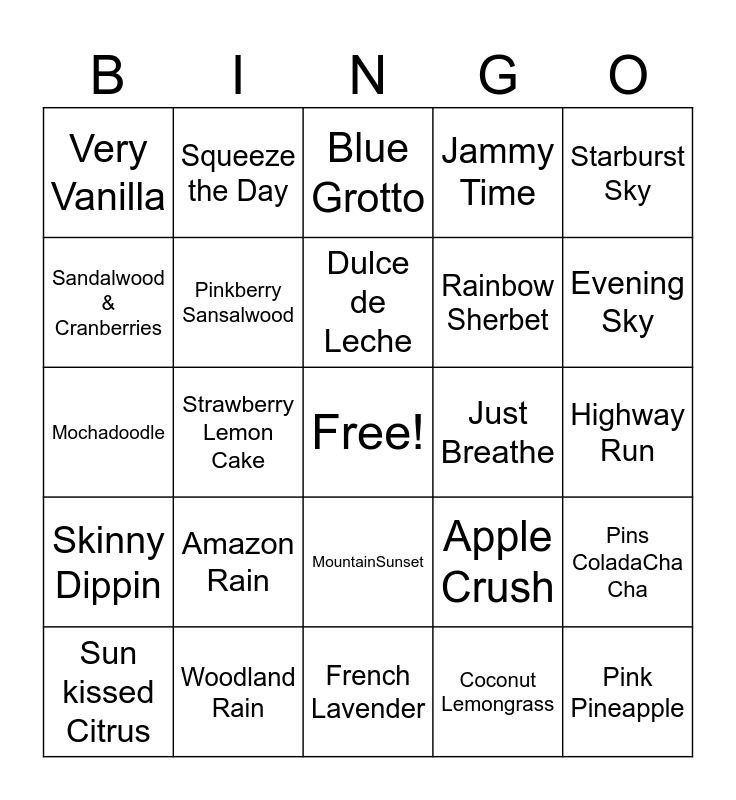 This bingo card has a free space and 24 words: Amazon Rain, Woodland Rain, Dulce de Leche, Sun kissed Citrus, Starburst Sky, Very Vanilla, Sandalwood & Cranberries, Squeeze the Day, Just Breathe, MountainSunset, Rainbow Sherbet, Mochadoodle, Apple Crush, Pins ColadaCha Cha, Pinkberry Sansalwood, Coconut Lemongrass, Highway Run, Blue Grotto, Evening Sky, Strawberry Lemon Cake, Pink Pineapple, Skinny Dippin, Jammy Time and French Lavender.