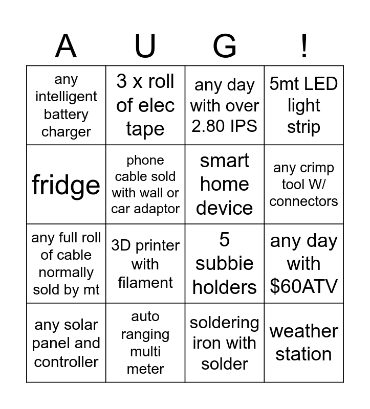 This bingo card has 16 words: auto ranging multi meter, any day with $60ATV, any day with over 2.80 IPS, any intelligent battery charger, any full roll of cable normally sold by mt, 3 x roll of elec tape, 5 subbie holders, soldering iron with solder, fridge, phone cable sold with wall or car adaptor, any solar panel and controller, 5mt LED light strip, 3D printer with filament, any crimp tool W/ connectors, smart home device and weather station.