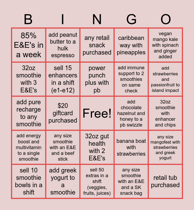 This bingo card has a free space and 42 words: angel food with protein and fiber, power punch plus with pb, almonds added into any smoothie, any size smoothie with an E&E and a beef stick, any size smoothie with an E&E and a SK snack bag, any size mangofest with strawberries and greek yogurt, retail tub purchased, $10 giftcard purchased, any retail snack purchased, 32oz gut health with 2 E&E's, 32oz smoothie with enhancer and chips, add strawberries and passionfruit to island impact, $20 giftcard purchased, vegan mango kale with spinach and ginger added, have a guest leave a 5-star review, banana boat with strawberries, add muscle builder to any protein smoothie, add pure recharge to any smoothie, have a guest follow us on instagram, add peanut butter to a hulk espresso, 32oz smoothie with 3 E&E's, add gut health to a 32oz smoothie, have a name mention on a survey, 85% E&E's in a week, add kale to a 32oz smoothie, 70% E&E's in a week, add immune support to 2 smoothies on same check, sell 5 energy boost enhancers in a shift, add fiber to any fruit smoothie, add any extra to a 44oz smoothie, add 3 enhancers to any smoothie (E1-E12), add energy boost and multivitamin to a single smoothie, sell 15 enhancers in a shift (e1-e12), sell 50 extras in a shift (veggies, fruits, juices), add protein to a protein smoothie, sell 10 smoothie bowls in a shift, add greek yogurt to a smoothie, add chocolate hazelnut and honey to a pb swizzle, add items on a bowl, have a guest sign up for the app, caribbean way with pineapples and have a guest leave a 5-star review.