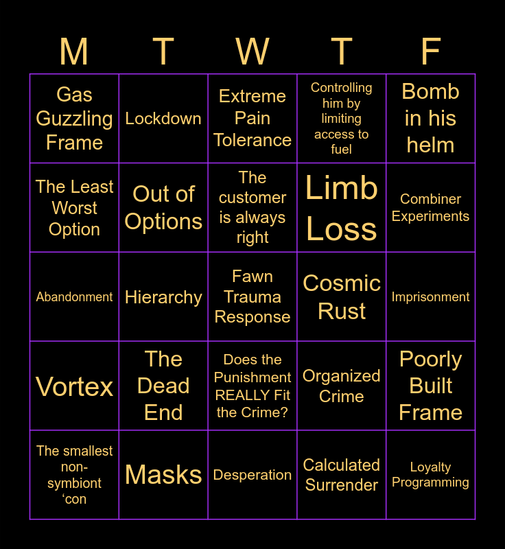 This bingo card has 25 words: The Dead End, Desperation, The customer is always right, The smallest non-symbiont ‘con, Bomb in his helm, Gas Guzzling Frame, The Least Worst Option, Lockdown, Cosmic Rust, Does the Punishment REALLY Fit the Crime?, Limb Loss, Abandonment, Organized Crime, Poorly Built Frame, Out of Options, Loyalty Programming, Imprisonment, Extreme Pain Tolerance, Combiner Experiments, Hierarchy, Fawn Trauma Response, Masks, Vortex, Controlling him by limiting access to fuel and Calculated Surrender.