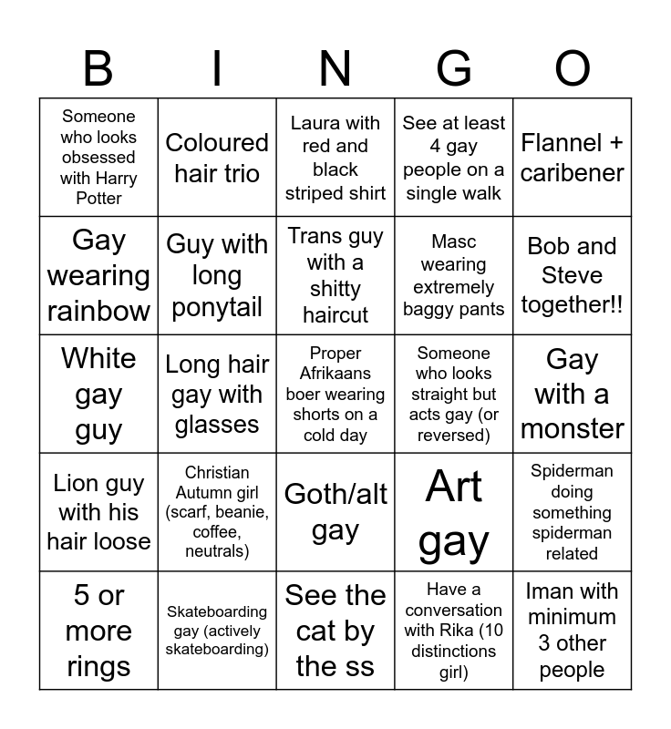 This bingo card has a free space and 24 words: Christian Autumn girl (scarf, beanie, coffee, neutrals), Skateboarding gay (actively skateboarding), Trans guy with a shitty haircut, 5 or more rings, Flannel + caribener, Someone who looks obsessed with Harry Potter, Gay wearing rainbow, Coloured hair trio, Someone who looks straight but acts gay (or reversed), Goth/alt gay, Masc wearing extremely baggy pants, White gay guy, Art gay, Spiderman doing something spiderman related, Guy with long ponytail, Have a conversation with Rika (10 distinctions girl), Gay with a monster, Laura with red and black striped shirt, Bob and Steve together!!, Long hair gay with glasses, Iman with minimum 3 other people, Lion guy with his hair loose, See at least 4 gay people on a single walk and See the cat by the ss.