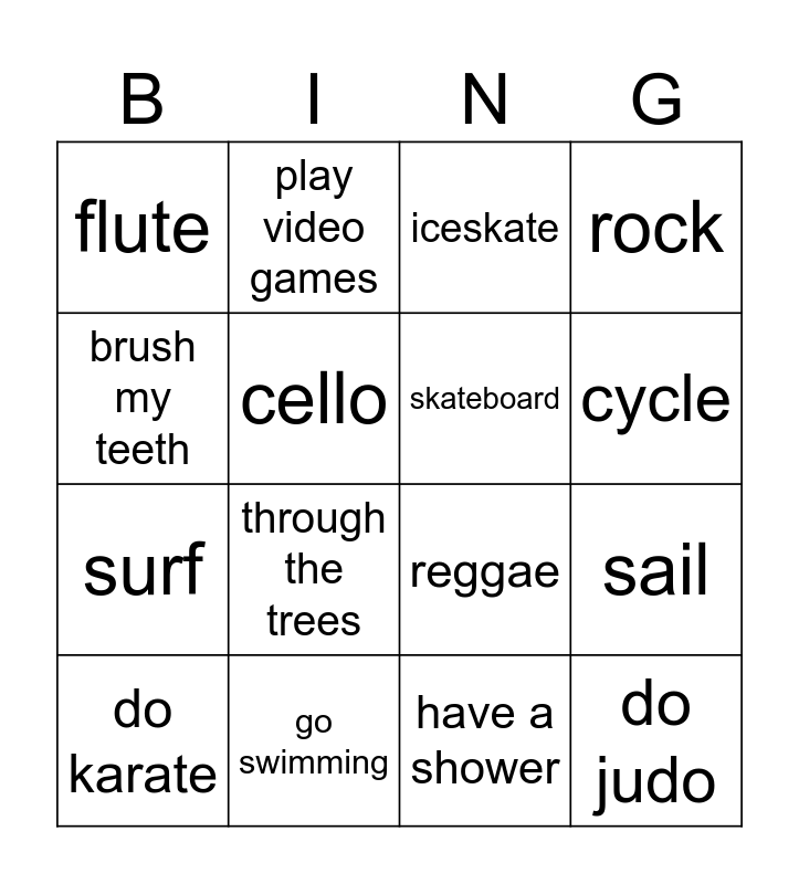 This bingo card has 16 words: go swimming, sail, iceskate, flute, surf, play video games, reggae, have a shower, brush my teeth, cello, do karate, rock, through the trees, cycle, skateboard and do judo.