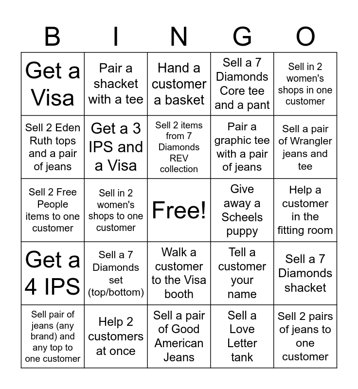 This bingo card has a free space and 29 words: Sell pair of jeans (any brand) and any top to one customer, Get a 3 IPS and sell an accessory, Sell in 2 women's shops to one customer, Sell 2 Thread and Supply to one customer, Get a Visa, Hand a customer a basket, Get a 3 IPS and a Visa, Sell a 7 Diamonds set (top/bottom), Give away a Scheels puppy, Help 2 customers at once, Help a customer in the fitting room, Sell 2 pairs of jeans to one customer, Sell a pair of Good American Jeans, Sell a Love Letter tank, Sell a pair of Wrangler jeans and tee, Get a customers name, Walk a customer to the Visa booth, Get a 4 IPS, Sell in 2 women's shops in one customer, Sell 2 Free People items to one customer, Tell a customer your name, Sell a pair of Kut jeans, Pair a graphic tee with a pair of jeans, Sell 2 Eden Ruth tops and a pair of jeans, Sell a 7 Diamonds Core tee and a pant, Pair a shacket with a tee, Sell a 7 Diamonds shacket, Sell 2 items from 7 Diamonds REV collection and Help pick out a first day of school outfit.