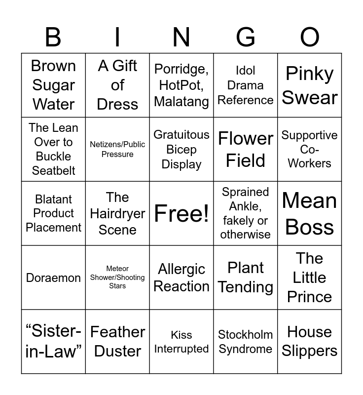 This bingo card has a free space and 75 words: The Piggyback Ride, The Coat Scene (to cover exposed flesh and/or to cover someone sleeping, Porridge, HotPot, Malatang, Tending to Wound Scene, Band Aid, First Aid Kit, Poetry, Quotation, Internet Slang Reference, Mean Meddling Mother, Coffee, Boba Tea, Accidental Kiss, Couple Toothbrushes, Indirect Kiss, Amusement Park Visit, Gratuitous Bicep Display, The Lean Over to Buckle Seatbelt, Braised Pork Belly, The Hairdryer Scene, Eyelid Tape, House Slippers, Apple Peeling Scene, Pinky Swear, 999 Medicine, Blatant Product Placement, Netizens/Public Pressure, A Gift of Dress, Idol Drama Reference, Karaoke/KTV, Epic Bromance, Zhù nǐ shēng rì kuài lè, Facial Mask, Crawfish, Out of Town Field Trip, Bidong - The Lean, The Stare, The Smolder, The Almost Kiss, Falling Into Water, Plant Tending, Supportive Co-Workers, Flower Field, Emergency Room Visit, A Writer Friend, Mean Boss, Stockholm Syndrome, Period Cramps, Idol Reference, Truth or Dare, The Cold Shower, The Forever Stare, Loving Stepparent, “Sister-in-Law”, Brown Sugar Water, “The Girls Court/Pursue Me”, Honey Water, Cotton Candy, Allergic Reaction, Princess Carry, Reflect on Yourself (Self-Reflection), Rock Paper Scissors, Wedding Ring Necklace Pendant, Blanket Scene, Fireworks, Have an Orange, Jai Yo!, Meteor Shower/Shooting Stars, Spring Festival, Eating Watermelon with a Spoon, EQ, Wishing Tree, Sprained Ankle, fakely or otherwise, The Earlobe Touch for Burnt Fingers, Couple Mugs, Slippers, towels, Sliced Fruit Tray, The Little Prince, Doraemon, Feather Duster, New Year’s Eve, Kiss Interrupted and Bad Peach Blossom.