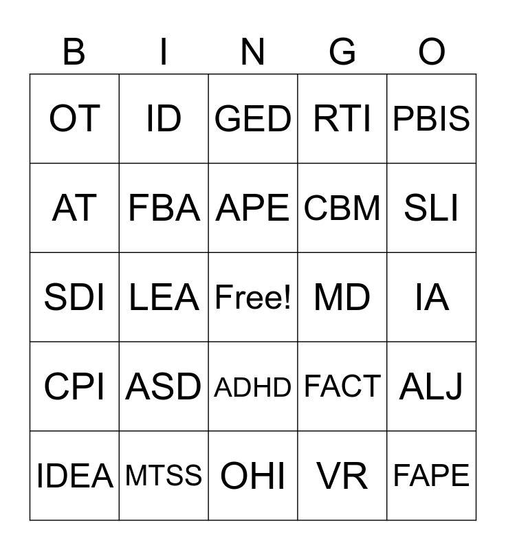 This bingo card has a free space and 44 words: IEP, FAPE, ADA, IDEA, SPED, VR, GED, ABA, PBIS, MTSS, RTI, MD, ADHD, ASD, EBD, OHI, LRE, SDI, SLD, SLI, ID, DHH, VI, OT, PT, IA, ERC, ILS, FACT, CPI, TBI, ALJ, DHS, ODE, LEA, OCR, PWN, SLP, APE, AT, CBM, ESY, FBA and BIP.