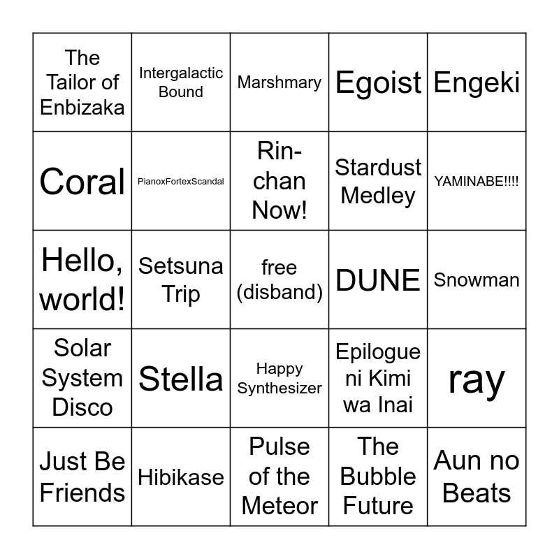 This bingo card has a free space and 24 words: Stella, Hibikase, Rin-chan Now!, Just Be Friends, Engeki, The Tailor of Enbizaka, Coral, Intergalactic Bound, DUNE, Happy Synthesizer, Stardust Medley, Hello, world!, Epilogue ni Kimi wa Inai, ray, PianoxFortexScandal, The Bubble Future, Snowman, Marshmary, YAMINABE!!!!, Setsuna Trip, Aun no Beats, Solar System Disco, Egoist and Pulse of the Meteor.