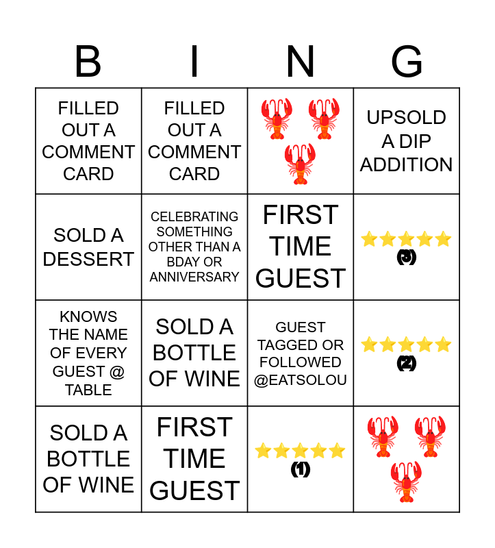 This bingo card has 16 words: FIRST TIME GUEST, ⭐⭐⭐⭐⭐ (2), 🦞🦞🦞, FILLED OUT A COMMENT CARD, KNOWS THE NAME OF EVERY GUEST @ TABLE, FILLED OUT A COMMENT CARD, GUEST TAGGED OR FOLLOWED @EATSOLOU, ⭐⭐⭐⭐⭐ (1), SOLD A DESSERT, CELEBRATING SOMETHING OTHER THAN A BDAY OR ANNIVERSARY, SOLD A BOTTLE OF WINE, UPSOLD A DIP ADDITION, SOLD A BOTTLE OF WINE, ⭐⭐⭐⭐⭐ (3), FIRST TIME GUEST and 🦞🦞🦞.