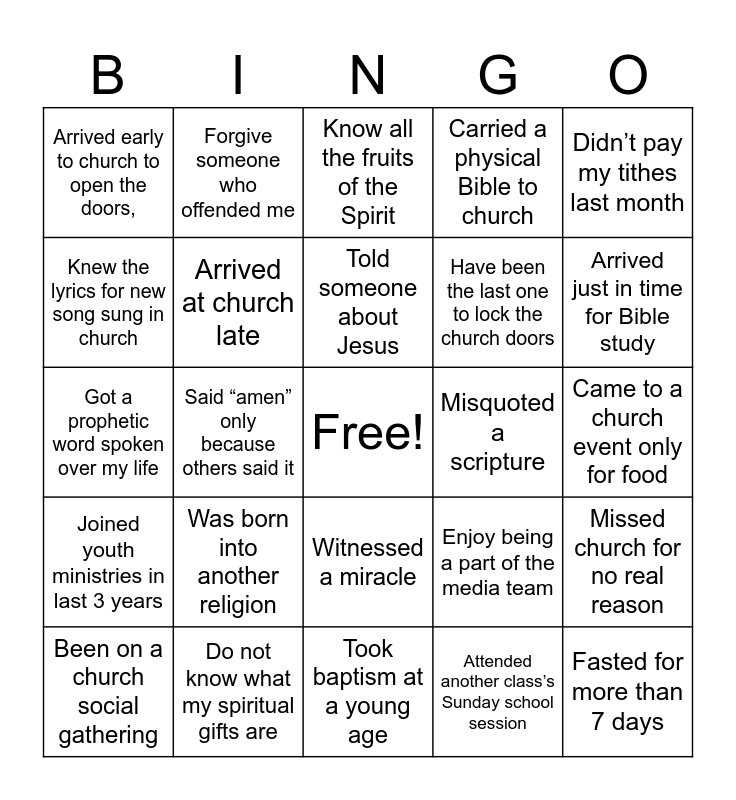 This bingo card has a free space and 39 words: Waited until the end of the message to use the bathroom, Invited a person to church, Went to Sunday school last week, Arrived at church late, Been on a church social gathering, Witnessed a miracle, Told someone about Jesus, Fell to the ground when being prayed for, Didn’t pay my tithes last month, Joined youth ministries in last 3 years, Said “amen” only because others said it, Carried a physical Bible to church, Fasted for more than 7 days, Came to a church event only for food, Misquoted a scripture, Was born into another religion, Fell asleep while the pastor was preaching, Arrived early to church to open the doors,, Forgot to take off the church sound system, Enjoy being a part of the media team, Knew the lyrics for new song sung in church, Took baptism at a young age, Have been the last one to lock the church doors, Arrived just in time for Bible study, Was inspired by the pastor’s message, Blessed a brother or sister in need, Heard the voice of the Holy Spirit, Offended by brother or sister, Unaware of what my spiritual gifts are, Forgive someone who offended me, Volunteered to fill a gap in seen in the church, Never spoke unknown tongues, Know all the fruits of the Spirit, Do not know what my spiritual gifts are, Attended another class’s Sunday school session, Received an encouragement from a church brother, Missed church for no real reason, Got a prophetic word spoken over my life and Didn’t take communion whilst at church.
