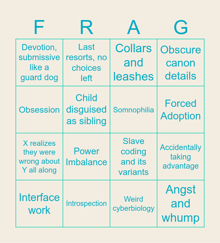 This bingo card has 16 words: Introspection, Accidentally taking advantage, Collars and leashes, Devotion, submissive like a guard dog, X realizes they were wrong about Y all along, Last resorts, no choices left, Slave coding and its variants, Weird cyberbiology, Obsession, Child disguised as sibling, Interface work, Obscure canon details, Power Imbalance, Forced Adoption, Somnophilia and Angst and whump.