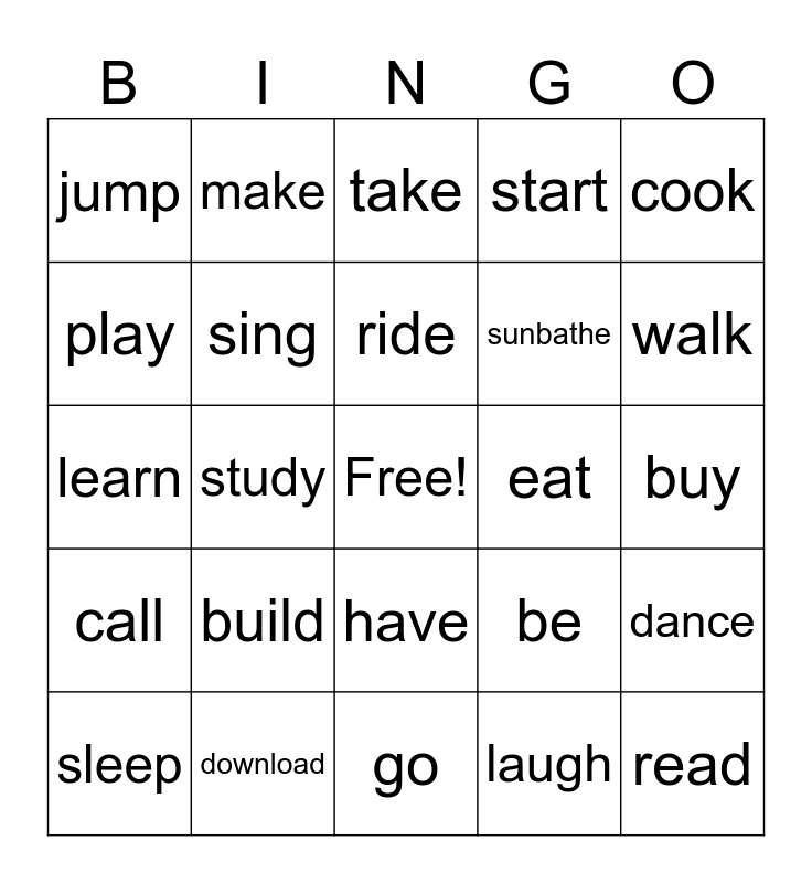 This bingo card has a free space and 25 words: build, go, ride, sleep, cook, jump, play, make, eat, have, sunbathe, learn, be, dance, sing, watch, buy, take, walk, study, read, download, call, start and laugh.