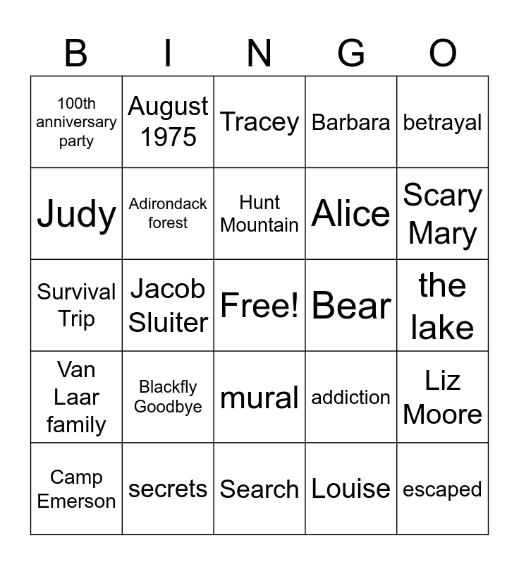 This bingo card has a free space and 28 words: Liz Moore, The God ot the Woods, Alice, Louise, Judy, Tracey, August 1975, Van Laar family, Bear, Camp Emerson, Survival Trip, Barbara, secrets, Search, Scary Mary, TJ Hewitt, Blackfly Goodbye, Adirondack forest, Hunt Mountain, mural, 100th anniversary party, missing, escaped, Jacob Sluiter, the lake, addiction, betrayal and Peter.