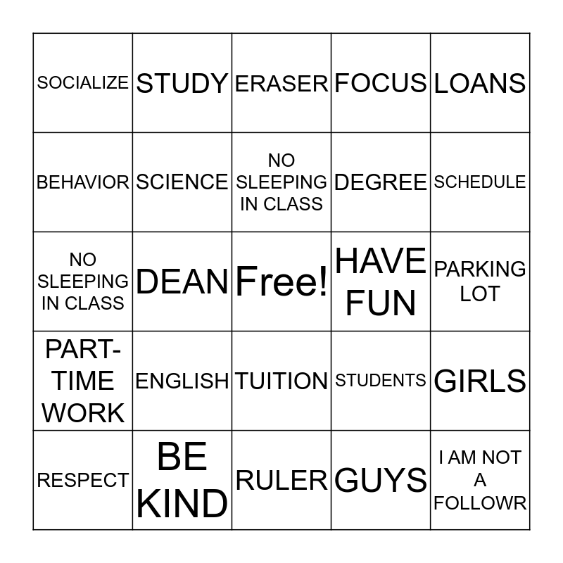 This bingo card has a free space and 24 words: ENGLISH, BE KIND, NO SLEEPING IN CLASS, RESPECT, LOANS, SOCIALIZE, BEHAVIOR, STUDY, HAVE FUN, TUITION, DEGREE, NO SLEEPING IN CLASS, STUDENTS, GIRLS, SCIENCE, GUYS, PARKING LOT, ERASER, SCHEDULE, DEAN, I AM NOT A FOLLOWR, PART-TIME WORK, FOCUS and RULER.