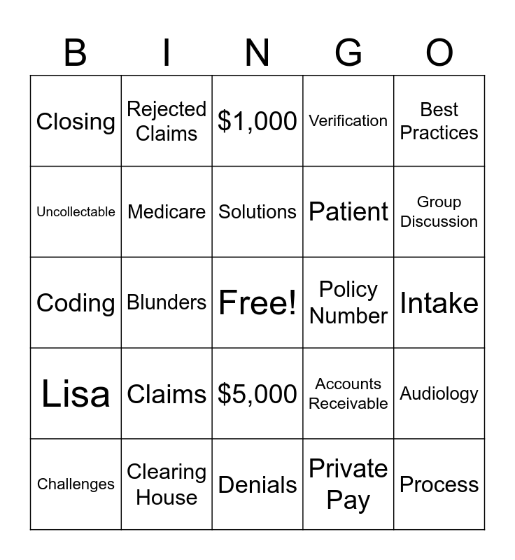 This bingo card has a free space and 37 words: Tony, Thank You, Portal, Medicare, Audiology, Claims, Solutions, Aging, Best Practices, Bank, Blunders, Verification, Process, Intake, Uncollectable, Lisa, Claim Submission, $1,000, $5,000, Policy Number, Closing, Group Discussion, Challenges, Denials, Cash Flow, Private Pay, Rejected Claims, Educate, Authorization, Hearing Aids, Audigy, Clearing House, Coding, Blue Cross, Accounts Receivable, Patient and Audigy Billing & Coding (ABC).