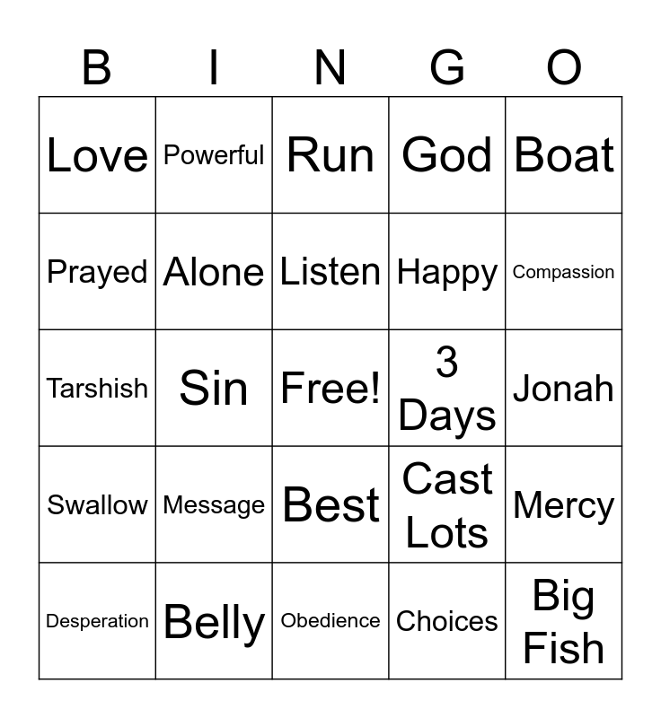 This bingo card has a free space and 40 words: Afraid, Tarshish, Promise, Alone, Belly, Best, Listen, Nineveh, Boat, Swallow, Sin, God, Big Fish, Jonah, 3 Days, Message, Land, Love, Storm, Run, Mercy, Choices, Happy, Prayed, Mountains, Sea, Thanksgiving, Repentence, Trust, Worship, Praise, Desperation, Sailors, Cast Lots, Compassion, Obedience, Second Chance, Destruction, Powerful and Personal.