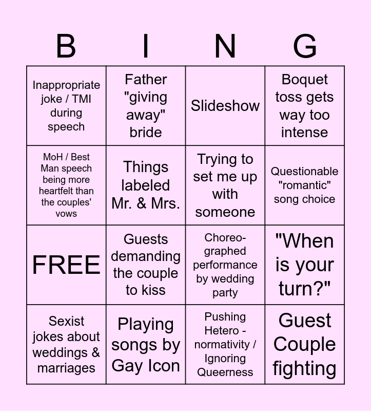 This bingo card has 16 words: Playing songs by Gay Icon, "When is your turn?", Slideshow, Inappropriate joke / TMI during speech, FREE, Father "giving away" bride, Choreo- graphed performance by wedding party, Pushing Hetero - normativity / Ignoring Queerness, MoH / Best Man speech being more heartfelt than the couples' vows, Things labeled Mr. & Mrs., Sexist jokes about weddings & marriages, Boquet toss gets way too intense, Guests demanding the couple to kiss, Questionable "romantic" song choice, Trying to set me up with someone and Guest Couple fighting.