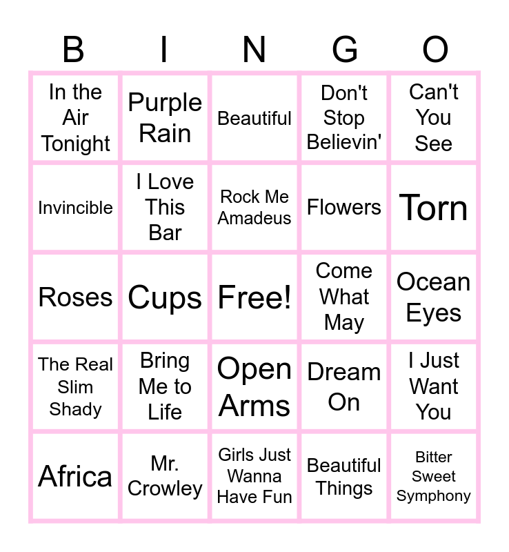 This bingo card has a free space and 24 words: Bring Me to Life, Mr. Crowley, Rock Me Amadeus, Africa, Can't You See, In the Air Tonight, Invincible, Purple Rain, Come What May, Open Arms, Flowers, Roses, Dream On, I Just Want You, I Love This Bar, Beautiful Things, Ocean Eyes, Beautiful, Torn, Cups, Bitter Sweet Symphony, The Real Slim Shady, Don't Stop Believin' and Girls Just Wanna Have Fun.