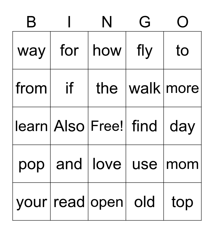 This bingo card has a free space and 24 words: and, read, the, your, to, way, from, for, find, love, walk, learn, use, mom, if, old, day, how, more, Also, top, pop, fly and open.