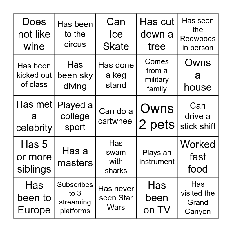 This bingo card has 25 words: Has a masters, Has never seen Star Wars, Has done a keg stand, Has been to Europe, Has seen the Redwoods in person, Does not like wine, Has been kicked out of class, Has been to the circus, Owns 2 pets, Has swam with sharks, Comes from a military family, Has met a celebrity, Plays an instrument, Worked fast food, Has been sky diving, Has visited the Grand Canyon, Can drive a stick shift, Can Ice Skate, Owns a house, Played a college sport, Can do a cartwheel, Subscribes to 3 streaming platforms, Has 5 or more siblings, Has cut down a tree and Has been on TV.
