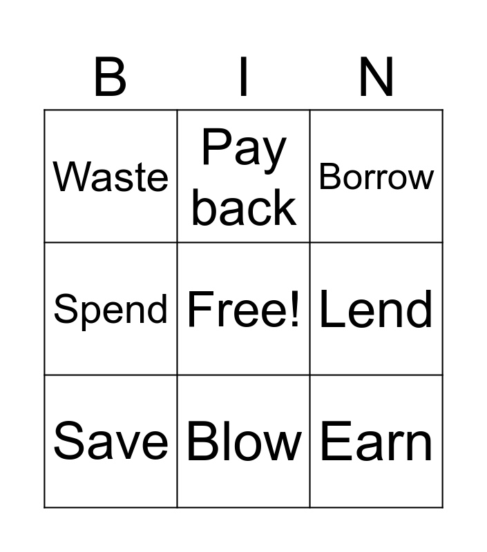 This bingo card has a free space and 8 words: Lend, Borrow, Pay back, Save, Waste, Earn, Spend and Blow.