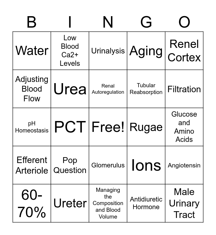 This bingo card has a free space and 24 words: Pop Question, Ureter, Renal Autoregulation, 60-70%, Renel Cortex, Water, Adjusting Blood Flow, Low Blood Ca2+ Levels, Rugae, Glomerulus, Tubular Reabsorption, pH Homeostasis, Ions, Angiotensin, Urea, Antidiuretic Hormone, Glucose and Amino Acids, Urinalysis, Filtration, PCT, Male Urinary Tract, Efferent Arteriole, Aging and Managing the Composition and Blood Volume.