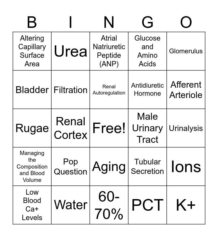 This bingo card has a free space and 24 words: Pop Question, Water, Renal Autoregulation, Low Blood Ca+ Levels, Glomerulus, Altering Capillary Surface Area, Bladder, Urea, Male Urinary Tract, Aging, Antidiuretic Hormone, Rugae, Tubular Secretion, Ions, Filtration, PCT, Urinalysis, Atrial Natriuretic Peptide (ANP), Afferent Arteriole, Renal Cortex, K+, Managing the Composition and Blood Volume, Glucose and Amino Acids and 60-70%.