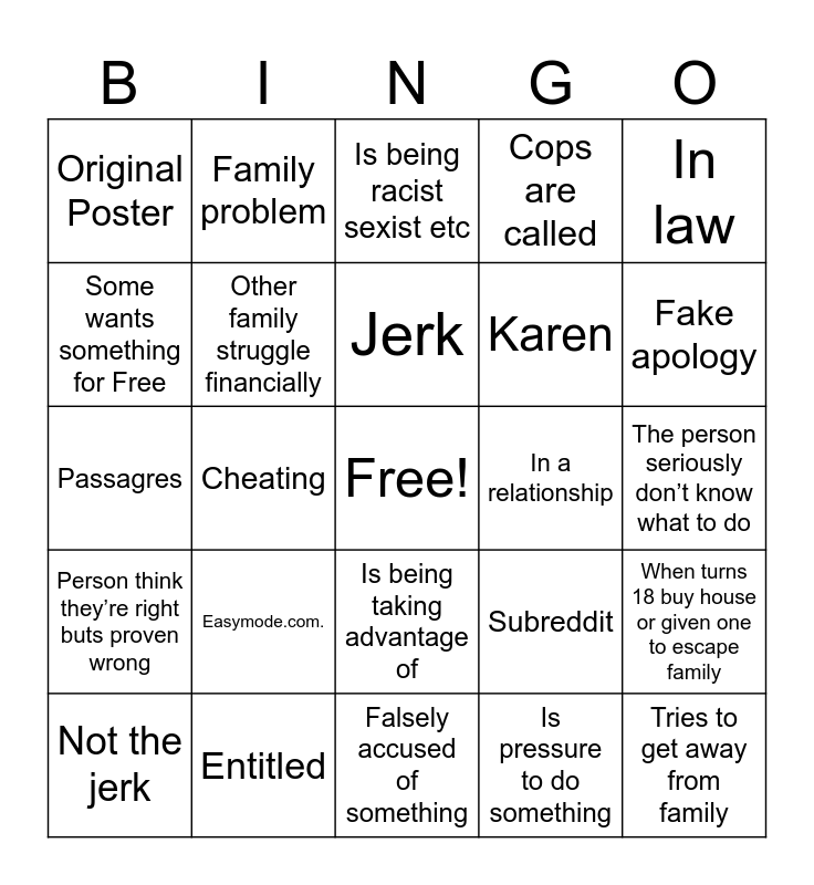 This bingo card has a free space and 24 words: Easymode.com., Entitled, Jerk, Not the jerk, In law, Original Poster, Some wants something for Free, Family problem, In a relationship, Is being taking advantage of, Karen, Passagres, Subreddit, When turns 18 buy house or given one to escape family, Other family struggle financially, Is pressure to do something, The person seriously don’t know what to do, Is being racist sexist etc, Fake apology, Cheating, Tries to get away from family, Person think they’re right buts proven wrong, Cops are called and Falsely accused of something.