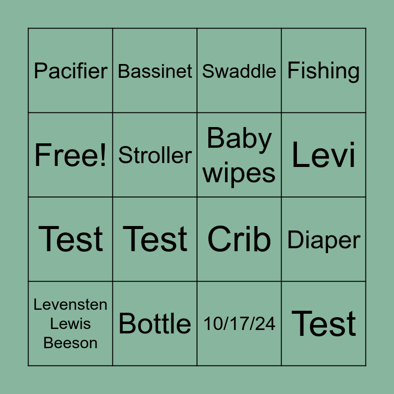 This bingo card has 16 words: Bottle, Diaper, Swaddle, Pacifier, Test, Bassinet, Crib, 10/17/24, Free!, Stroller, Levensten Lewis Beeson, Fishing, Test, Levi, Baby wipes and Test.