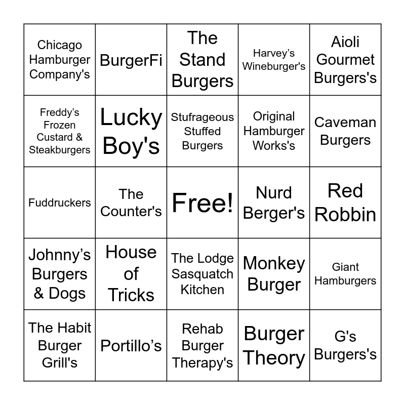 This bingo card has a free space and 57 words: tAPing cAPing lAPing, The Habit Burger Grill's, In-N-Out Burger's, Chicago Hamburger Company's, Rehab Burger Therapy's, Lenny’s Burger's, Lucky Boy's, Five Guys's, Original Hamburger Works's, The Dirty Drummer's, Harvey’s Wineburger's, The Stand Arcadia Burger Shoppe's, Shake Shack's, The Chuckbox's, Paradise Valley Burger Company's, Hopdoddy Burger Bar's, Aioli Gourmet Burgers's, The Counter's, Zinburger Wine & Burger Bar's, G's Burgers's, Nurd Berger's, Joe's Farm Grill, Monkey Burger, The Stand Burgers, Detroit Coney Grill, Stufrageous Stuffed Burgers, Bing's Burger Station, Delux Burger, Caveman Burgers, B2 Burgers and Brews, Arizona Wilderness Brewing Co., The Attic Ale House, Laura’s Burgers and More, Southern Rail, Red Robbin, Freddy’s Frozen Custard & Steakburgers, Culver’s, Fuddruckers, Cold Beers and Cheeseburgers, Johnny’s Burgers & Dogs, BurgerFi, The Lodge Sasquatch Kitchen, Culinary Dropout, Americana Tempe, Mo’ Burger, Rally’s, House of Tricks, Portillo’s, Four Peak’s Brewing Company, Social Hall, Rocket Burger and Subs, Burger Theory, XL California Burger Co, Burger Mania, Haven Burgers, Giant Hamburgers and BurgerIM.