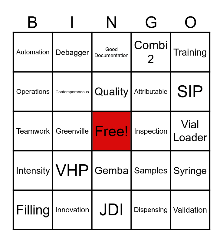 This bingo card has a free space and 62 words: Integrity, Innovation, Involvement, Intensity, Accurate, Legible, Contemporaneous, Original, Attributable, Combi 1, Combi 2, Line 9, Operations, Maintenance, Engineering, Automation, Validation, Training, Tech. Support, Quality, Inspection, Good Documentation, Filling, Dispensing, Compounding, Manufacturing, Warehouse, Vial, Syringe, Stopper, Over Seal, Autoclave, Parts Washer, Trayloader, Vial Loader, Debagger, Freeze Dryer, Thermo Fisher, Greenville, Leadership, Teamwork, Work Order, VHP, CIP, SIP, Samples, SAP, Gowning, PPE, PPI, Gemba, JDI, Safety, EHS, Smoke Study, MTI, API, Glove Extender, Bubble Point, Cycle Run Report, HMI and SCADA.