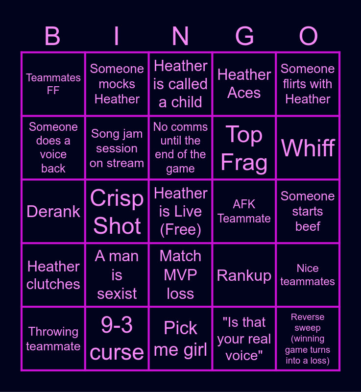 This bingo card has a free space and 25 words: A man is sexist, Pick me girl, No comms until the end of the game, Throwing teammate, Someone flirts with Heather, Teammates FF, Someone does a voice back, Someone mocks Heather, AFK Teammate, Match MVP loss, Top Frag, Derank, Rankup, Nice teammates, Song jam session on stream, Someone dodges, Someone starts beef, Heather is called a child, Whiff, Crisp Shot, Reverse sweep (winning game turns into a loss), 9-3 curse, Heather clutches, Heather Aces and "Is that your real voice".