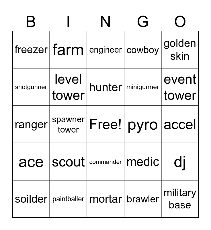 This bingo card has a free space and 24 words: scout, paintballer, hunter, soilder, golden skin, freezer, shotgunner, farm, pyro, commander, minigunner, ranger, medic, dj, level tower, brawler, accel, engineer, event tower, spawner tower, military base, ace, cowboy and mortar.