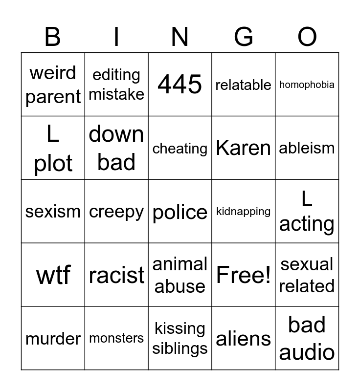 This bingo card has 25 words: racist, kissing siblings, cheating, murder, homophobia, weird parent, L plot, editing mistake, kidnapping, animal abuse, Karen, sexism, Free!, sexual related, down bad, bad audio, L acting, 445, ableism, creepy, police, monsters, wtf, relatable and aliens.