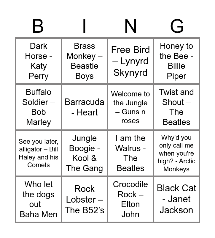 This bingo card has 54 words: The Lion Sleeps Tonight - tight fit, Black Cat - Janet Jackson, Take it easy – Eagles, Accidentally in love - Counting Crows, I'm like a bird - Nelly Furtado, Dog Days are Over - Florence + The Machine, Honey to the Bee - Billie Piper, Hound dog - Elvis Presley, Barracuda - Heart, Blackbird - The Beatles, Dark Horse - Katy Perry, Wild Horses - The Rolling Stones, I am the Walrus - The Beatles, What's new Pussycat - Tom Jones, Karma Chameleon - Culture Club, Eye of the Tiger - Survivor, Who let the dogs out – Baha Men, See you later, alligator – Bill Haley and his Comets, Hungry like the Wolf – Duran Duran, Crocodile Rock – Elton John, When Doves Cry – Prince, A Horse with No Name – America, George Martin, Rock Lobster – The B52’s, Buffalo Soldier – Bob Marley, Cats in the Cradle – Harry Chapin, Brass Monkey – Beastie Boys, Tiger – ABBA, Octopus’s garden – The Beatles, Daydream Believer – The Monkees, I’m a Believer – The Monkees, Happy Together – The Turtles, Shake a Tail Feather – The Blues Brothers, Mr Jones – Counting Crows, Rockin’ Robin – Bobby Day, Free Bird – Lynyrd Skynyrd, Dog eat Dog – ACDC, I am the Walrus - The Beatles, Walk on the Wild Side – Luo Reed, Wild World – Yusuf/Cat Stevens, Welcome to the Jungle – Guns n roses, Skinny Love – Birdy, Two Birds – Regina Spektor, Animals – maroon 5, House of the Rising Son – The Animals, Born to be Wild – Steppenwolf, Wild Side – Motley Crue, Roar – Katy Perry, Wild Thing – The Troggs, Twist and Shout – The Beatles, Why'd you only call me when you're high? - Arctic Monkeys, Jungle Boogie - Kool & The Gang, Wild Wild Life - Talking Heads, Amigas Cheetahs - The Cheetah Girls and The Wild Boys - Duran Duran.