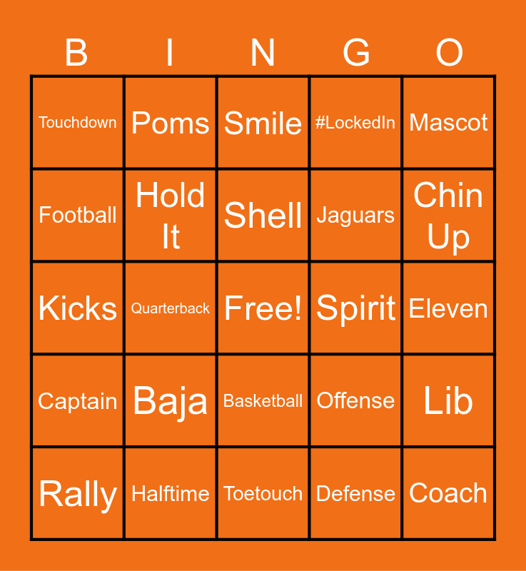 This bingo card has a free space and 24 words: Baja, Halftime, Shell, Rally, Mascot, Touchdown, Football, Poms, Spirit, Basketball, Jaguars, Kicks, Offense, Lib, Hold It, Defense, Eleven, Smile, Chin Up, Quarterback, Coach, Captain, #LockedIn and Toetouch.